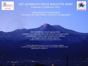 CONCORSO FOTOGRAFICO “Uno scatto raro sotto l’albero di Chiari e siringomielia“. L’iniziativa ripercorre gli eventi del 2019 e del 2020, quando con il progetto “100 alberi per Catania”, realizzato da Legambiente, è stato acquistato, grazie ai simpatizzanti Aismac, “L’Albero Raro di Arnold Chiari e Siringomielia”. Messo a dimora il 28 febbraio 2019 a cura dell’Amministrazione Comunale di Catania, l’albero ha stentato a crescere e dopo due anni appare ancora spoglio. Su richiesta dell’Aismac, l’Assessorato al verde e all’ecologia sta provvedendo a sostituirlo. Porterà sul tronco una mattonella bianca con il nome di Chiari Siringomielia e Aismac.