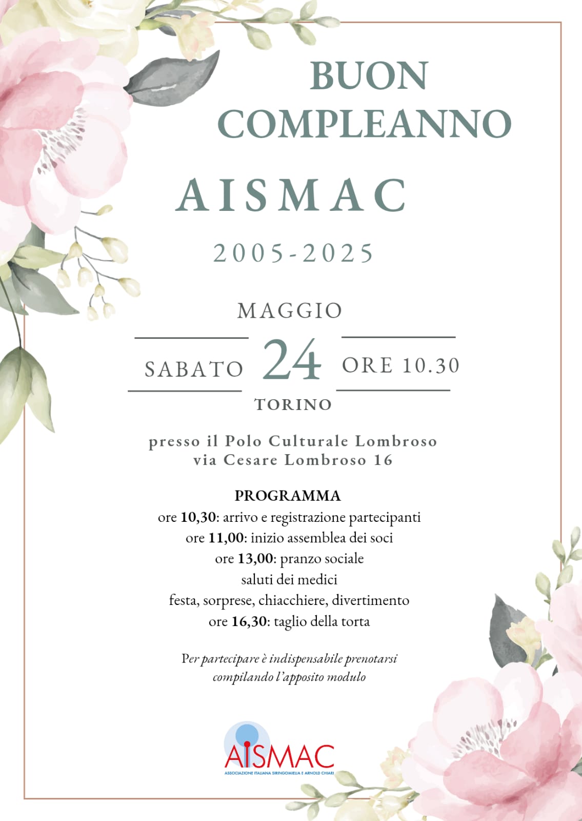Il 18 maggio 2005, grazie all’iniziativa di Carlo e Paola Celada, nasceva AISMAC, la prima associazione italiana delle persone con Chiari, siringomielia e patologie correlate. Quest’anno cade quindi il nostro ventesimo compleanno!