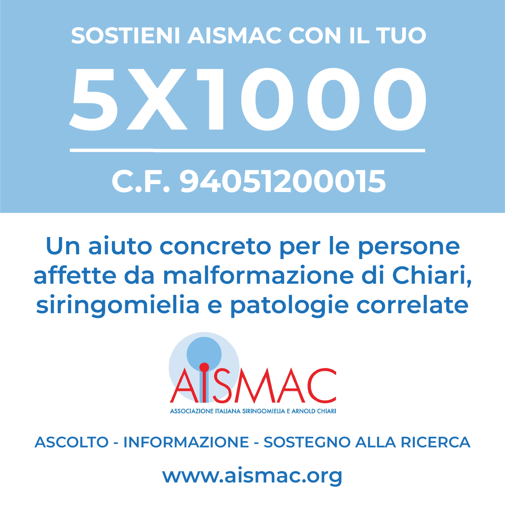 Scegli di destinare il tuo 5×1000 ad Aismac, la prima associazione italiana delle persone affette da malformazione di Chiari, siringomielia e patologie correlate.